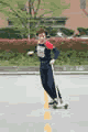 スティックで操作せず、足の裏でコントロールしましょう。ボードの上でつま先からかかと、かかとからつま先へと体重移動していきます。 2m〜2.5m間隔でパイロンを立てて練習しましょう